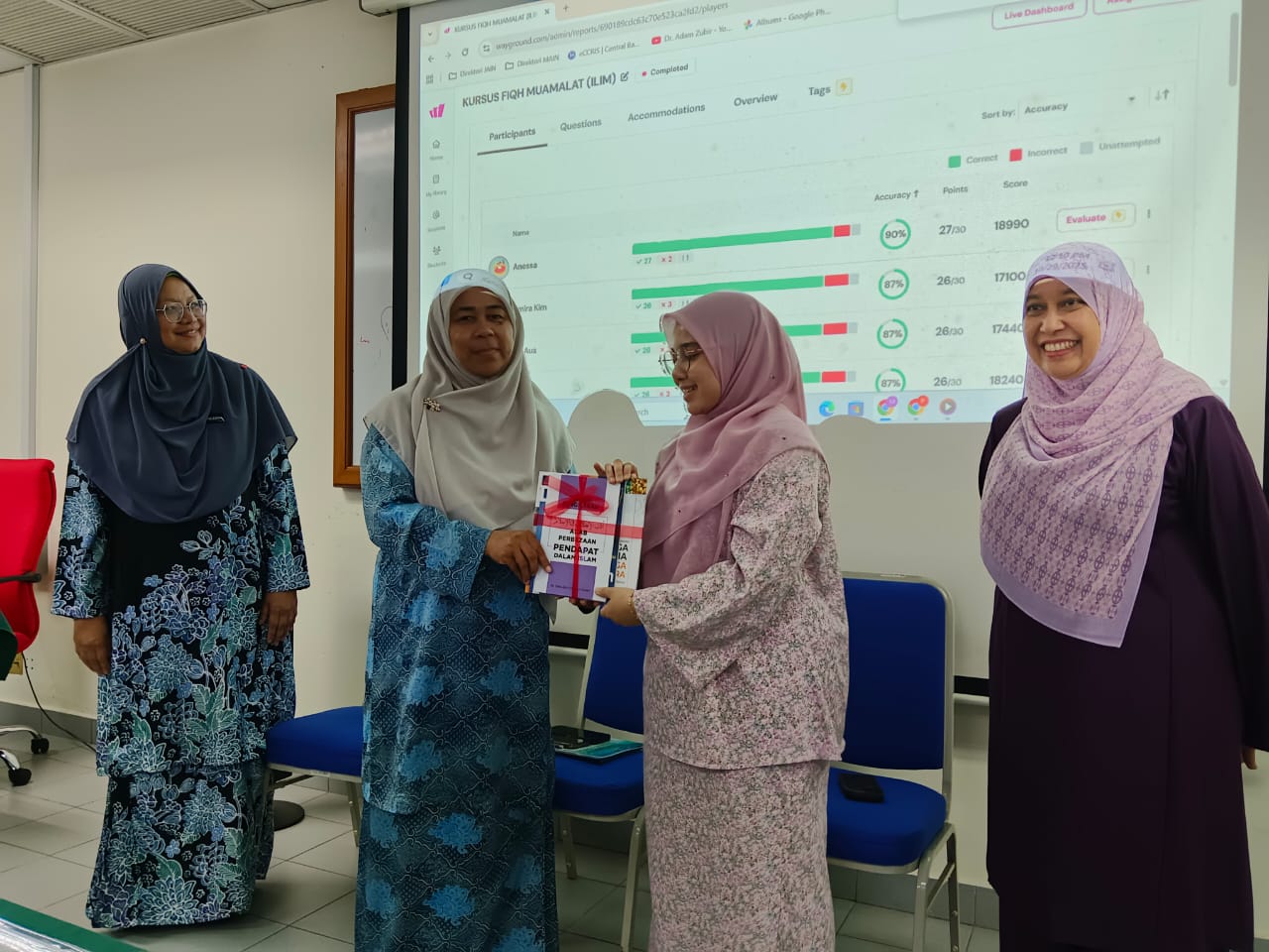 Selain itu, peserta turut berpeluang mengukuhkan kefahaman terhadap pelbagai istilah dan konsep asas fiqh muamalat seperti fiqh, maqasid syar‘iyyah, riba, gharar, maysir, aqad, murabahah, ijarah, musyarakah, wadiah, serta produk-produk kewangan Islam seperti bay‘ tawarruq dan pembiayaan peribadi berasaskan prinsip syariah.