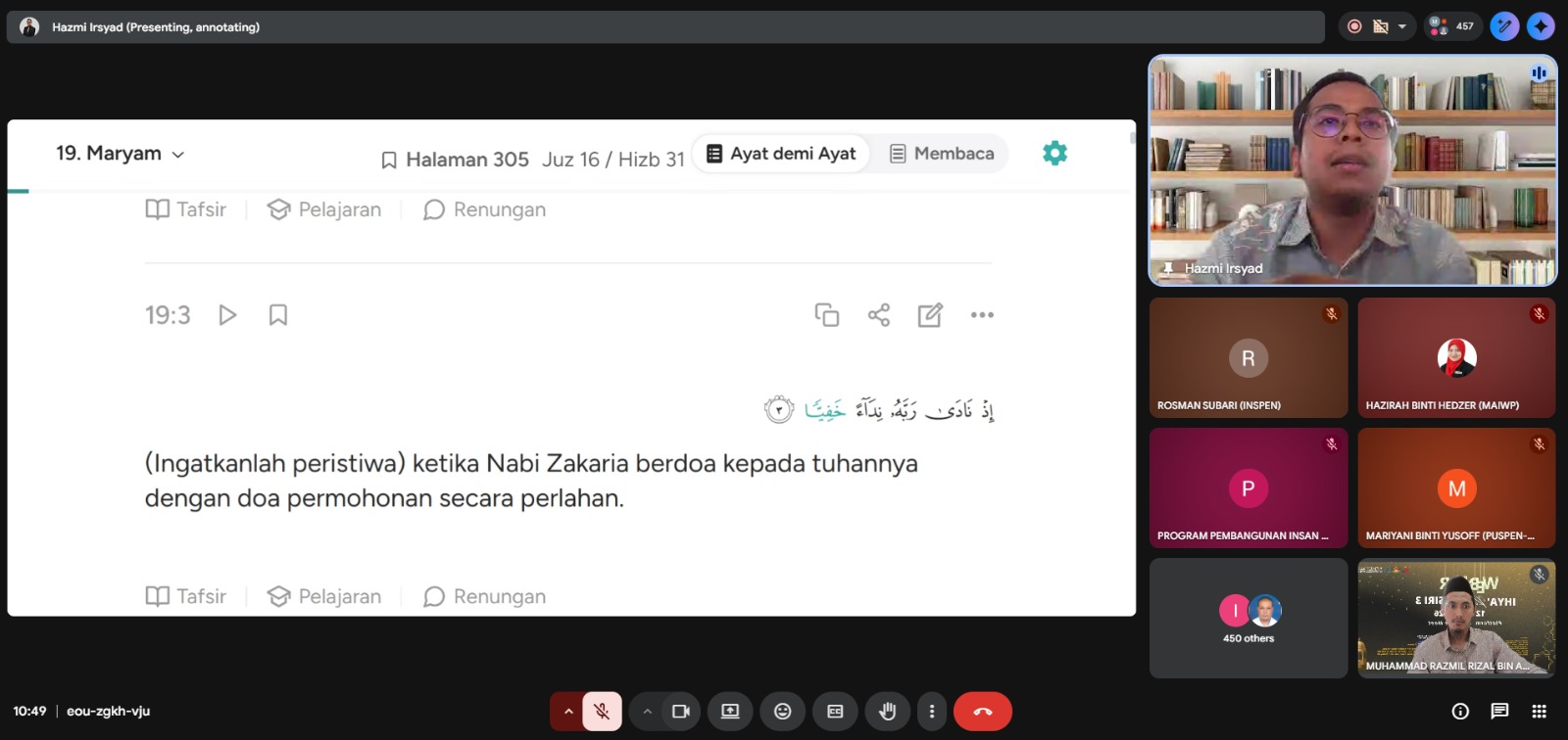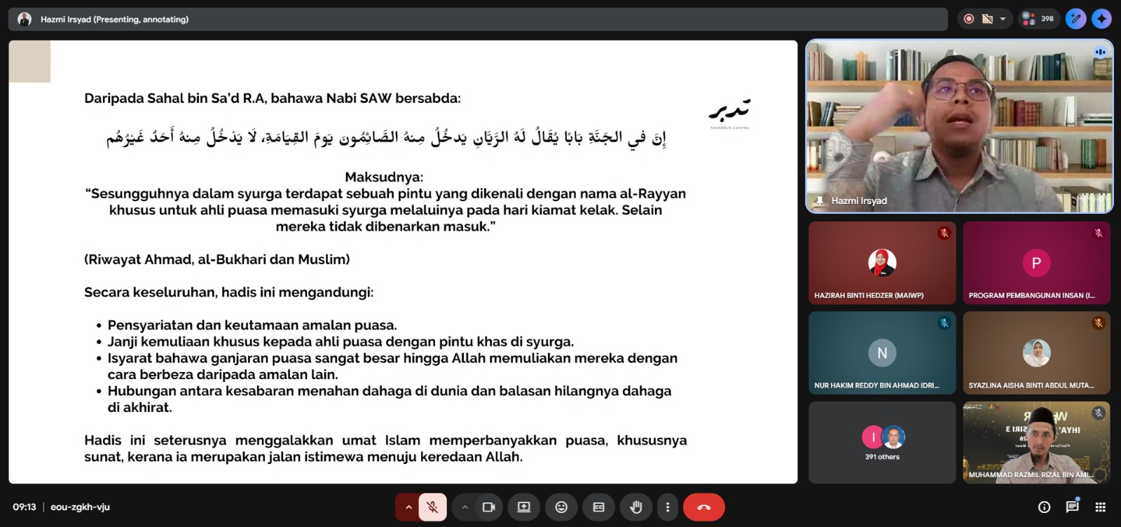 Webinar yang berlangsung secara dalam talian melalui platform Google Meet ini telah disampaikan oleh Ustaz Hazmi Irsyad bin Mohamad Noor Azman yang menekankan kepentingan memanfaatkan bulan Ramadan sebagai peluang terbaik untuk meningkatkan amal ibadah, memperbanyakkan taubat serta berusaha mendapatkan keampunan Allah SWT.
