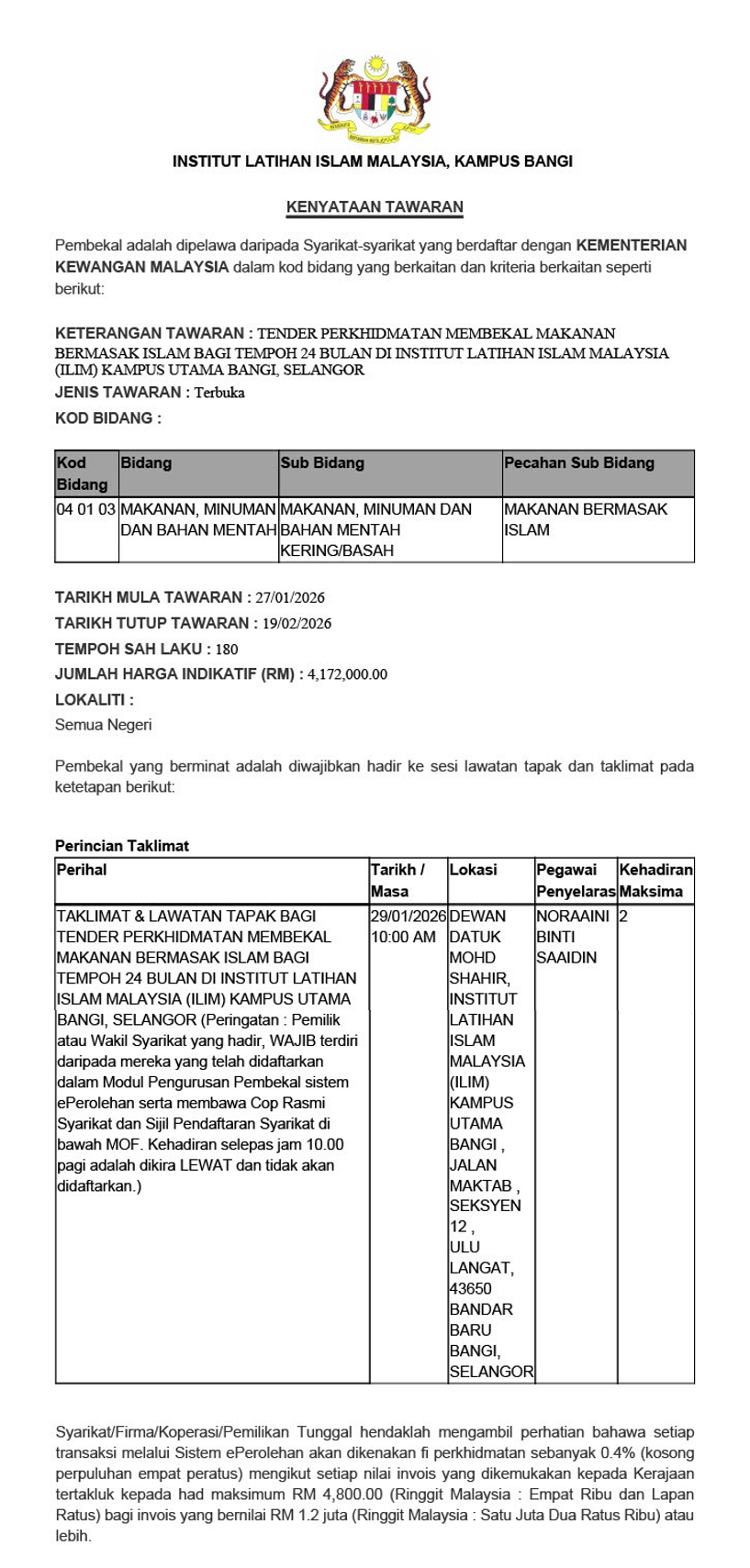 Kenyataan Tawaran: Perkhidmatan Membekal Makanan Bermasak Islam Bagi Tempoh 24 Bulan Di ILIM Kampus Utama Bangi, Selangor
